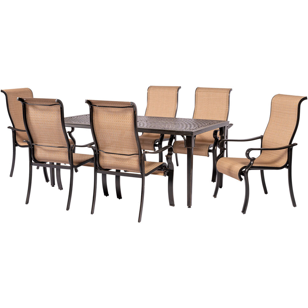 Amplify your outdoor entertaining space with this 7-piece patio dining set from the Brigantine Collection by Hanover. Crafted with high-quality materials and attention to detail, our beautiful coastal dining furniture offers the ultimate in comfort, style, and durability. It includes a large rectangular cast-top table and six contour-sling stationary chairs. Each item is built to last outdoors, using heavy-duty aluminum treated with a multi-step, weather-protective finish to prevent rust and corrosion. An elegant cast-aluminum lattice and scroll design sweeps across the tabletop, adding to the set's overall appeal. The contoured textaline sling fabric on all the chairs is strong, UV-resistant, and quick-drying, ideal for all-weather use. Each chair is shaped to the natural curves of your back and knees for long-lasting comfort and support. Fabric, frames, and tabletop are designed with earthy color tones that complement any environment. Easy to clean and maintain, simply wipe with a solution of mild soap and water, then rinse clean and dry with a soft absorbent cloth towel. This Brigantine dining combination is the perfect solution for creating a comfortable and attractive outdoor haven for family, friends, and guests to enjoy meals, celebrations, and holidays day or night, season after season, year after year.