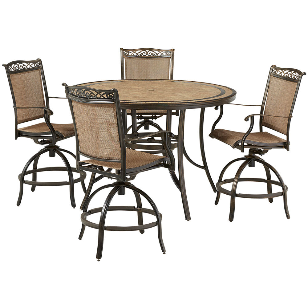 Take comfortable dining to the next level with the Fontana 5-piece high-dining set from Hanover. This set includes four counter-height swivel chairs and a 56-in. tile-top table. The chairs and table are constructed with heavy-duty aluminum frames, dressed with elegant cast details, and finished with a protective bronze coating. Each chair performs a 360-degree spin with ease and is created using premium PVC sling fabric to provide unprecedented durability and comfort. The neutral-toned fabric blends perfectly with any decor, in addition to being moisture-, stain- and UV-resistant. The round tile-top dining table is covered in neutral-tone porcelain tiles and offers ample room for food and beverages as well as a generous amount space for entertaining guests. Built-to-last, this high-dining set will bring each meal to new heights and greet your guests with the ultimate comfort.