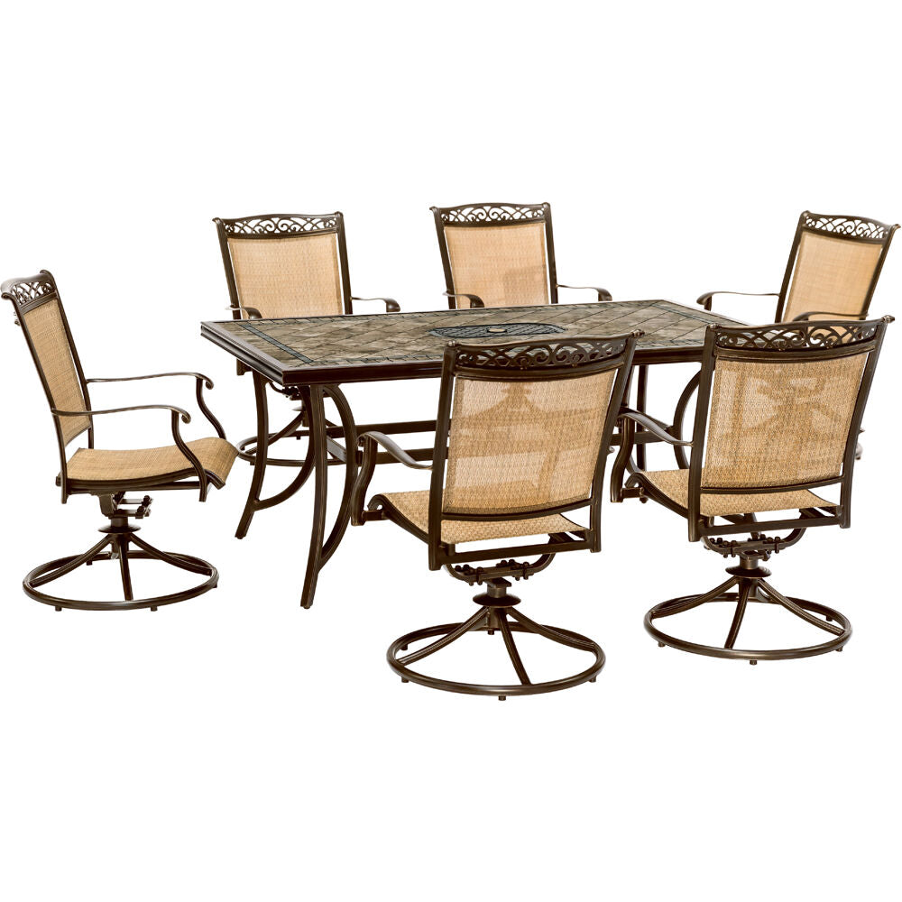 Transform your backyard into an elegant outdoor dining area with the Fontana 7-piece dining set by Hanover. This set includes one large dining table and six sling swivel rockers. Both sophisticated and refined, this set creates an alluring centerpiece for your backyard and adds extra convenience and functionality while you’re entertaining guests outdoors. The 68 x 40 in. table-top consists of neutral-toned porcelain tiles, handcrafted to create a rich mosaic pattern. Each chair is constructed with heavy-duty aluminum frames that naturally resist rust and corrosion. Laser-cut accents sweep across the top of each chair, adding even more appeal to the collection. Designed to last, this outdoor dining set will provide an elegant, natural setting for many meals with your loved ones in the comfort of your own backyard.