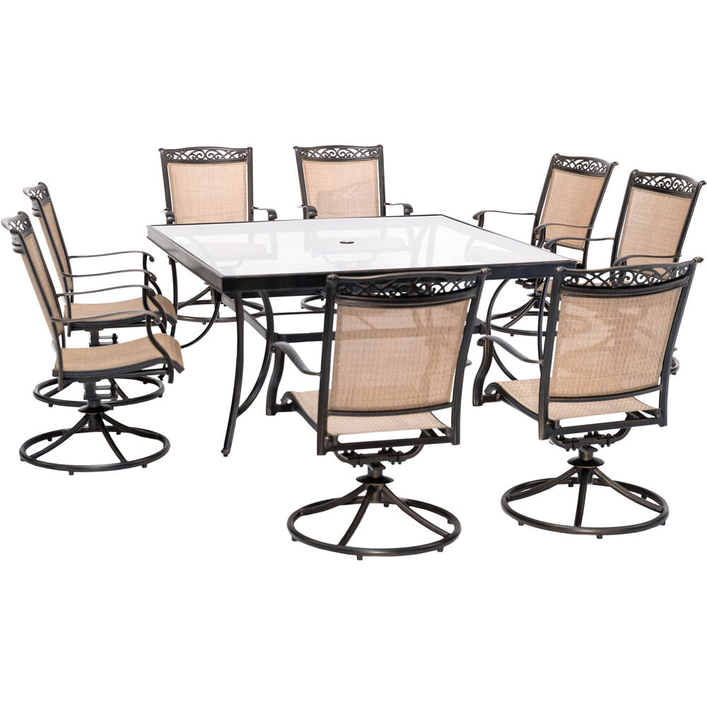 Hanover Fontana9pc: 8 Sling Swivel Rockers, 60" Square Glass Top Table80