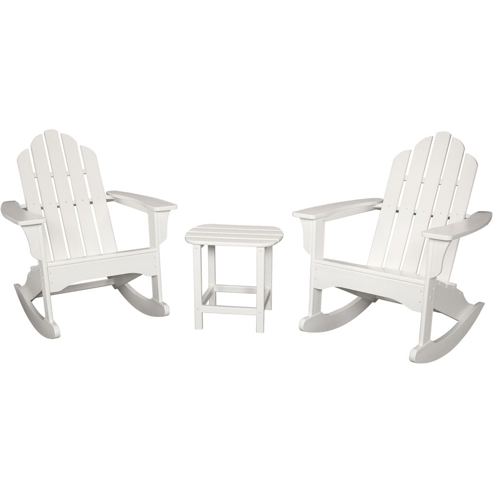 Relax in style with Hanover’s 3-Piece All-Weather Rocking Adirondack Patio Set. This traditional rocking set includes two Adirondack rocking chairs and a 19"x15" side table. This set instantly brightens up any patio or deck area, creating an intimate conversation set that will provide durable rocking comfort and function year after year. Each piece is constructed of durable HDPE, an eco-friendly lumber made with purified polymers. Unlike authentic wood furniture, this material will never peel, chip, or split naturally. It resists corrosive substances, insects, salt, UV fading, and other environmental strain. Truly built to last, no painting, staining, waterproof treatment, or other maintenance necessary! It’s sturdy base and wide arm rests insure strength and stability bound together by commercial-grade stainless steel hardware. Hanover backs this set with a 20-year limited warranty, so you can be sure this 3-piece rocking set will last you many years to come.