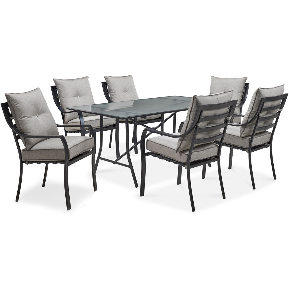Spend more time outdoors with the Lavallette Dining Collection by Hanover Home. Crafted with high-quality materials and attention to detail, this collection offers the ultimate in comfort, style, and durability. This 7-piece set includes a decorative table with an inset tempered glass top and six comfortable chairs, complete with plush cushions. Both the table and chair frames are constructed using rust-resistant, heavy-duty steel that has been powder coated to increase their life spans and additionally protect against scratches and UV rays. Designed to mix contemporary design with classic comfort, the chairs come with both back and seat cushions for maximum relaxation. They are made using thick foam and wrapped in a high-quality olefin material. They are water and stain resistant and dry quickly. Weather and wear are no match for this dining set's premium all-weather construction. You'll be able to enjoy more quality time outdoors with the Lavallette Dining Collection for years to come.