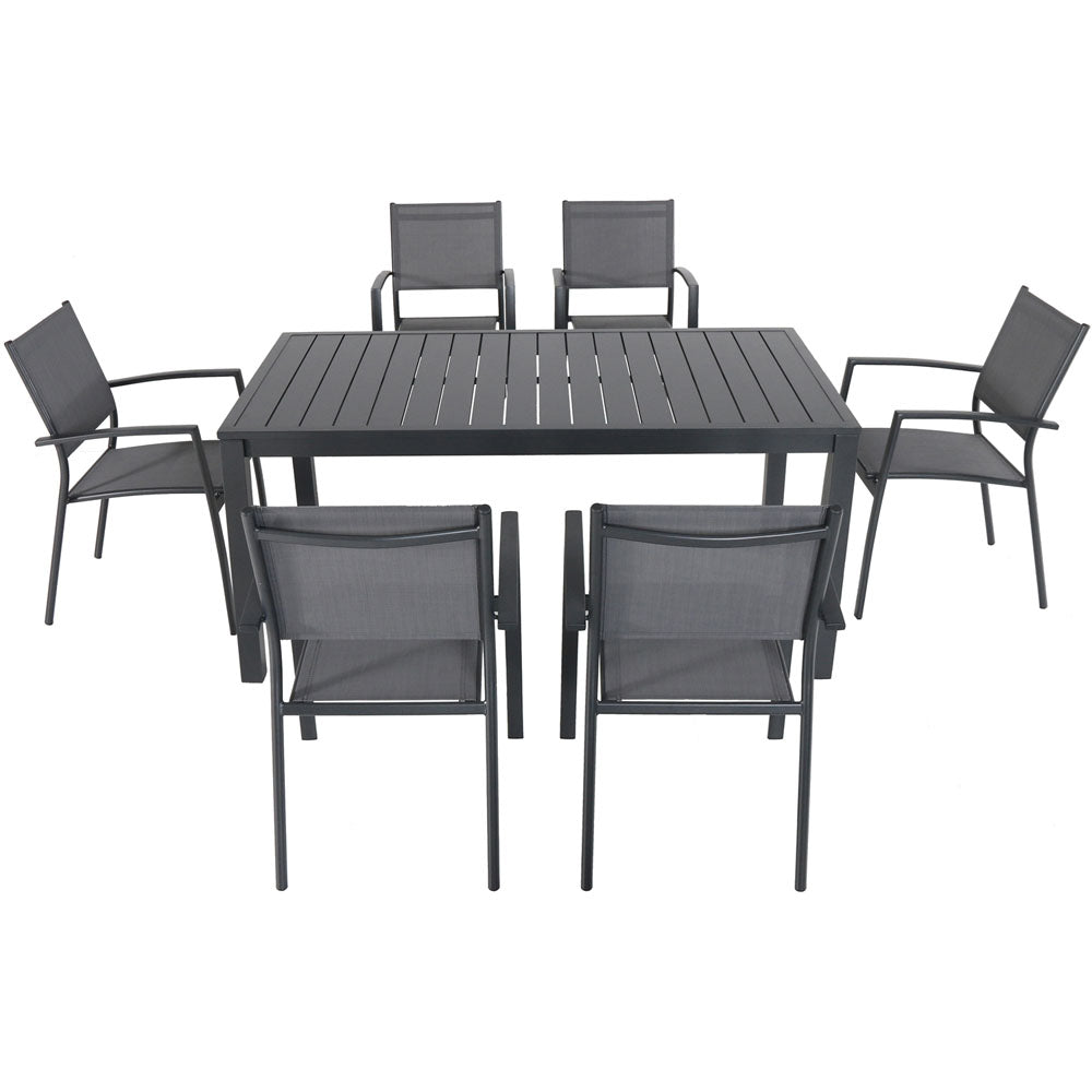 Step into the world of outdoor gatherings with the Naples 7-piece outdoor dining set from Hanover, where quality meets style for unforgettable family moments under the sun or stars. This all-weather ensemble features six comfortable sling chairs and a spacious 63" x 35" outdoor table, creating the perfect setting for leisurely meals and lively conversations. Radiating cool gray tones that exude a contemporary charm, this patio dining set effortlessly blends with any outdoor space, adding a touch of modern sophistication. The sturdy frames not only provide a striking visual appeal but also ensure long-lasting durability that withstands various weather conditions and wear over time. Picture this: lightweight chairs that are stackable and easy to store, allowing you to effortlessly transition from outdoor feasting to convenient storage without missing a beat. Whether you're basking in the sunshine with a refreshing cocktail or savoring a delicious dinner under the twinkling stars, the Naples patio table and chairs set is always poised and ready for your next backyard gathering. Create cherished memories as you relish in the beauty of togetherness, laughter, and delicious meals in your own backyard paradise. With Hanover, every moment becomes an opportunity to celebrate the art of living well.