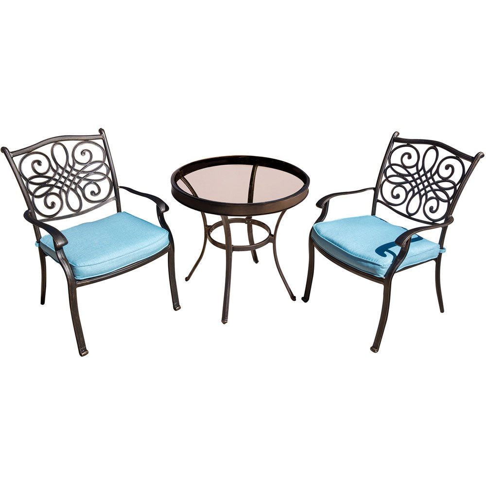 The Traditions 3-piece bistro set transforms any backyard into an intimate dining area fit for two. This set includes two cushioned dining chairs and one 30 in. round table. Both chairs and table feature cast-aluminum frames with a protective bronze finish. Swirls of cast accents decorate the back of each chair and adds an elegant touch used throughout the collection. The round bistro table features a tempered glass top that is strong, durable, and easy to clean. The plush seat cushions are constructed with premium outdoor fabric wrapped around polyurethane foam, ensuring deep comfort while maintaining their original full shape. The blue fabric is quick to dry while resisting accidental stains and UV harm. Perfect for smaller patios and environments where space may be limited, you can rely on Hanover to provide the most comfortable bistro dining under the sun.