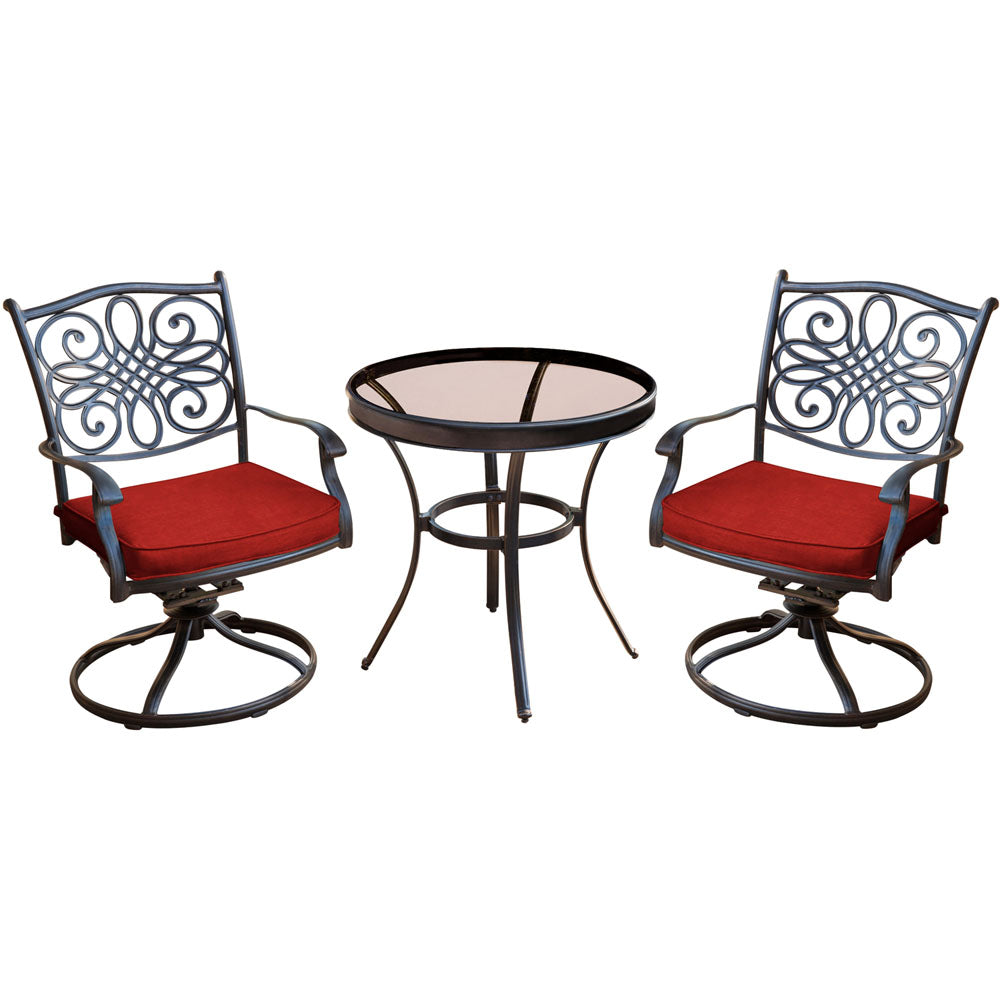 The Traditions 3-piece outdoor bistro set is a transformative addition to any backyard, creating an intimate dining area for two. The set includes two cushioned swivel chairs and a 30 in. round table. Both the chairs and table feature cast-aluminum frames with a protective bronze finish, offering durability and a touch of elegance. The back of each chair is adorned with swirls of cast accents, adding to the overall aesthetic of the collection. With the ability to perform a 360-degree spin and gentle rocking motion, the chairs provide a comfortable and stylish dining experience. The round bistro table is topped with tempered glass, ensuring strength, durability, and easy maintenance. The plush seat cushions are made with premium outdoor fabric wrapped around polyurethane foam, guaranteeing deep comfort while retaining their original shape. The red cushion fabric is quick to dry and highly resistant to accidental stains and UV harm. Designed for smaller patios and spaces where limited room is available, this 3 piece patio dining set from Hanover delivers the most stylish and sun-worthy bistro dining experience.