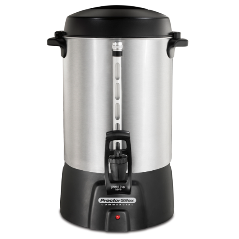 The Proctor Silex Commercial 60-Cup Aluminum Coffee Urn is built for busy hospitality and foodservice environments, offering fast brewing and reliable performance. With a durable aluminum body for even heat distribution, it features one-hand dispensing for convenient self-serve use and a coffee level indicator for quick fill checks. Ideal for hotels, catering, offices, and events, this high-capacity urn keeps coffee hot and ready, serving up to 60 cups with ease.